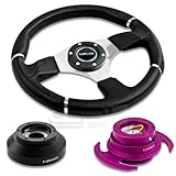 NRG-SRK-E30H+008R+650PP, NRG Innovations 13.78" 350mm Black Leather Racing Steering Wheel Combo with 6 Hole Short Hub Adapter with Gen 3.0 with Handle Purple Quick Release Kit SRK-E30HNRG Quick Release features many options that conventional ball-locking quick release system do not. It is specially engineered with raised sections to prevent the scratching and stretching of the hub while a self locking feature adds increased safety and functionality. Features racing styled for added style and look. Each unit is made from the highest quality aircraft grade aluminum and is anodized for maximum durability and finish.